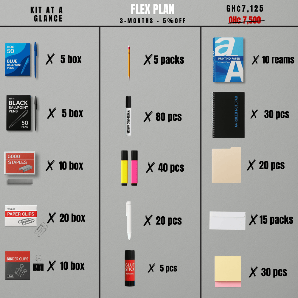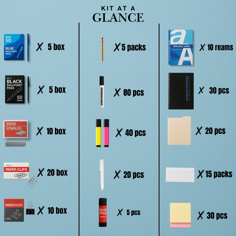 The ultimate supply solution for enterprises that demand scale, consistency, and efficiency. Designed to keep entire departments, branches, and HQs stocked with high-volume stationery, filing essentials, and workplace tools. From printing paper to desk organizers and toner, this kit ensures smooth operations without supply gaps.