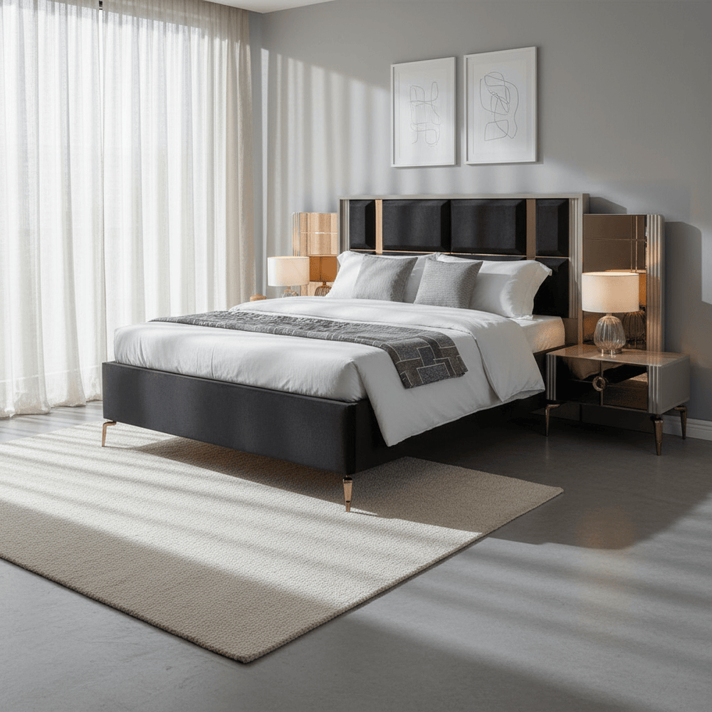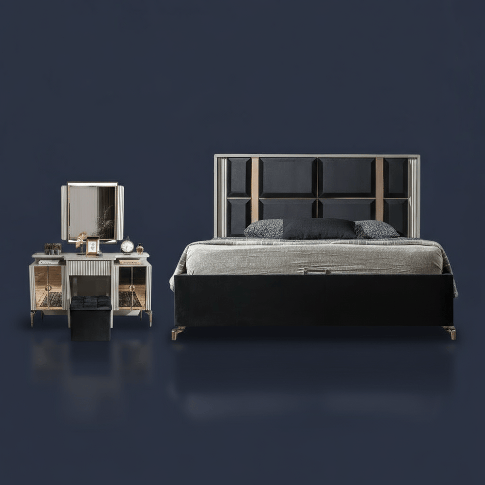 Create your perfect sanctuary with the Armi Bedroom Set, a comprehensive 5-piece suite featuring a storage bed, two side tables, dresser, and mirror. The centerpiece bed boasts a geometric headboard with metallic accents and practical under-bed storage. Modern side tables with mirrored surfaces complement the dresser and mirror, creating a cohesive, luxurious bedroom environment designed for both style and functionality.