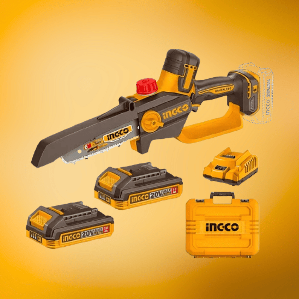 The Ingco CGSLI20662 Cordless Pruner Saw delivers exceptional power and runtime with its brushless motor and dual-battery system. Everything you need comes in the box, making it the ultimate cordless pruning solution for professionals and serious DIYers who demand performance and convenience