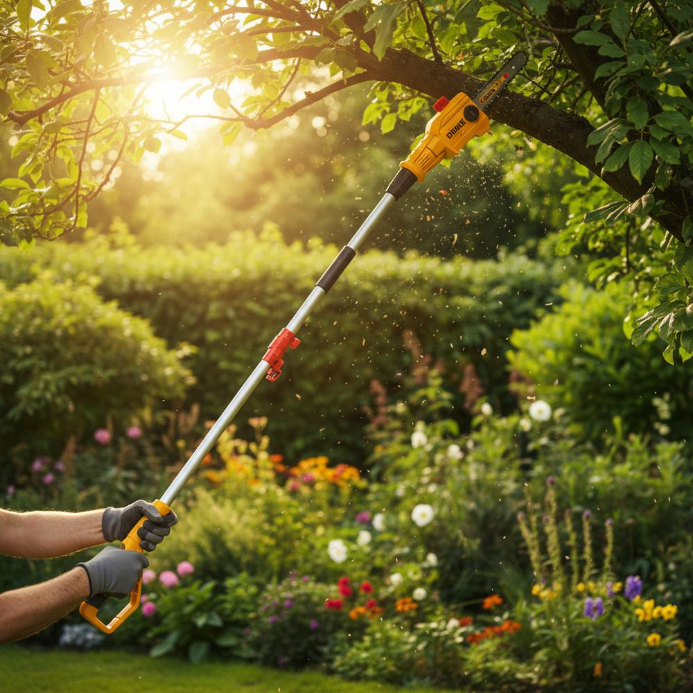 A cordless telescopic pole saw engineered for high-reach pruning and branch cutting without the need for a ladder. Featuring a brushless motor for superior performance, durability, and energy efficiency, it delivers reliable cutting power with an 8″ (20cm) bar and 11m/s chain speed. The telescopic design extends up to 2 meters (6.5 feet) total length, allowing comfortable, safe operation in gardens, orchards, and tree maintenance. Includes a shoulder strap for reduced fatigue, plus a 2.0Ah battery and charger for immediate use.