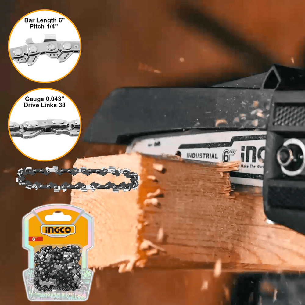 Keep your chainsaw performing at its best with the Ingco AGSC50601 replacement chainsaw chain. This precision-engineered 6-inch chain features a 1/4" pitch and 0.043" gauge with 38 drive links, designed for smooth, efficient cutting. Compatible with multiple Ingco chainsaw models, it's the perfect maintenance accessory for professional landscapers and homeowners alike.