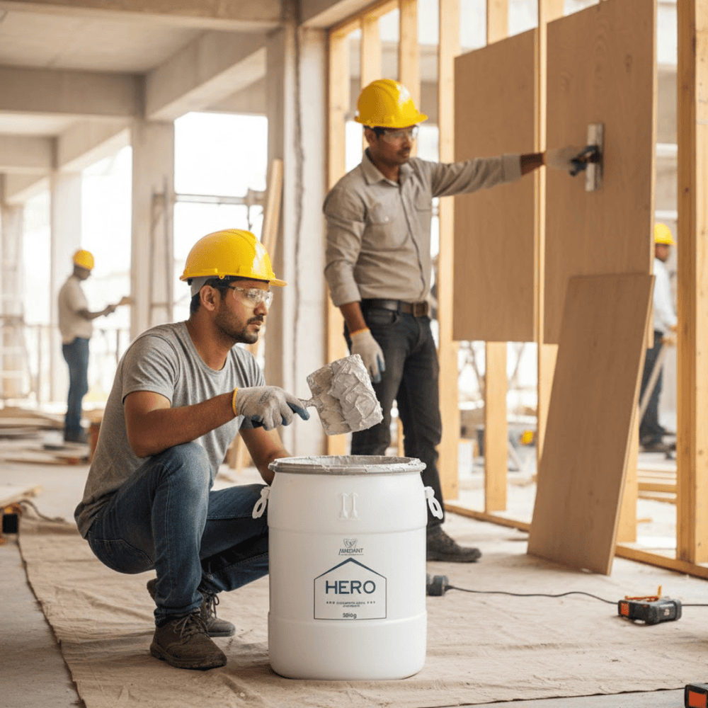 Formulated as a white, milky viscous emulsion and free of unpleasant odour, Jivanjor Hero delivers excellent coverage (~45-50 sq ft per kg) and manageable working time with a handling strength of 8–10 minutes under typical conditions. The 50 kg drum pack size offers excellent value for continuous production runs or large-scale joinery operations, helping reduce supply-chain disruption and frequent re-order cycles.