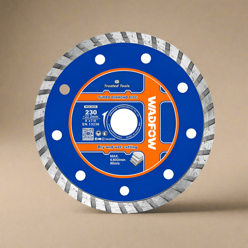 The Wadfow 230x22.2mm Turbo Diamond Cutting Disc – WDC3K05 is engineered for powerful cutting through concrete, stone, tiles, and masonry. Its 9" blade with a 7.5mm turbo edge delivers high-speed performance with minimal wear, making it ideal for construction pros and serious DIYers looking for durability and accuracy.