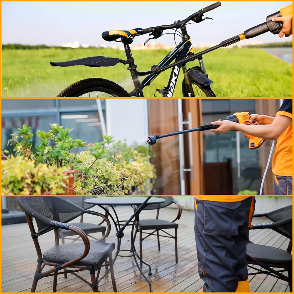 - Included Accessories: Fast charger, 6-pattern spray gun, 6m water inlet hose, self-suction connector, 400ml foam producer, and portable bag.