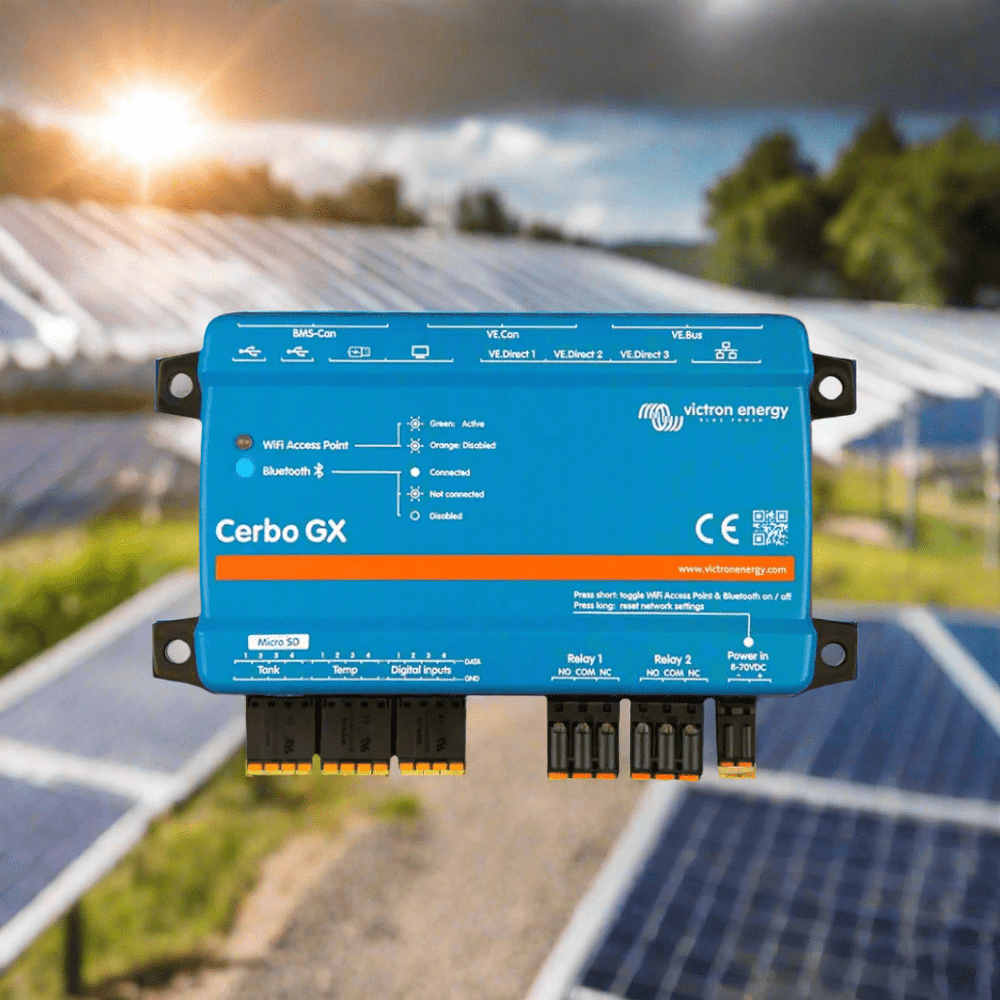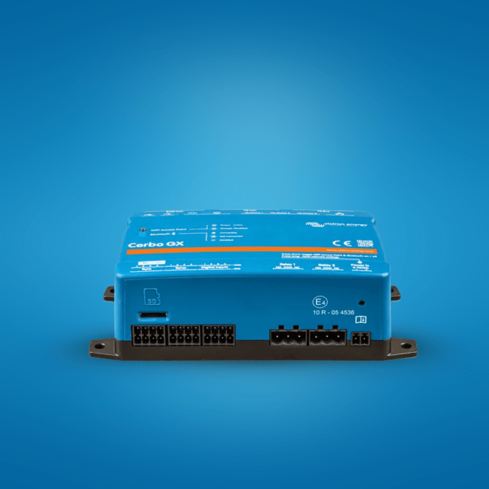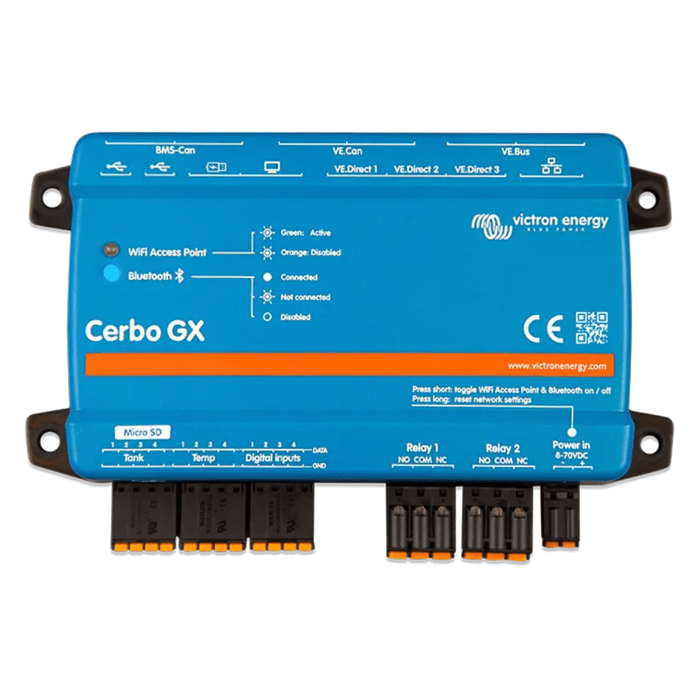 With built-in WiFi, Bluetooth, Ethernet, VE.Direct, VE.Bus, CAN, and multiple I/O ports, it supports complex systems with rich connectivity. You can monitor your system via Victron’s VRM portal, local network, or VictronConnect app, or pair the hub with GX Touch displays for a front-panel interface.
