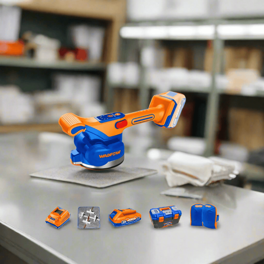 Achieve professional tile installations with the Wadfow Cordless Tile Vibration Machine. This 20V cordless tool delivers precise vibrational frequency up to 10,000 RPM, ensuring perfect adhesion by eliminating air pockets and maximizing mortar contact. Featuring a 130mm sucker with strong adsorbability (70kg vertical, 50kg horizontal), it securely holds tiles during placement. The complete kit includes a battery, charger, knee pads, and multiple tile spacer sets for a seamless tiling experience.