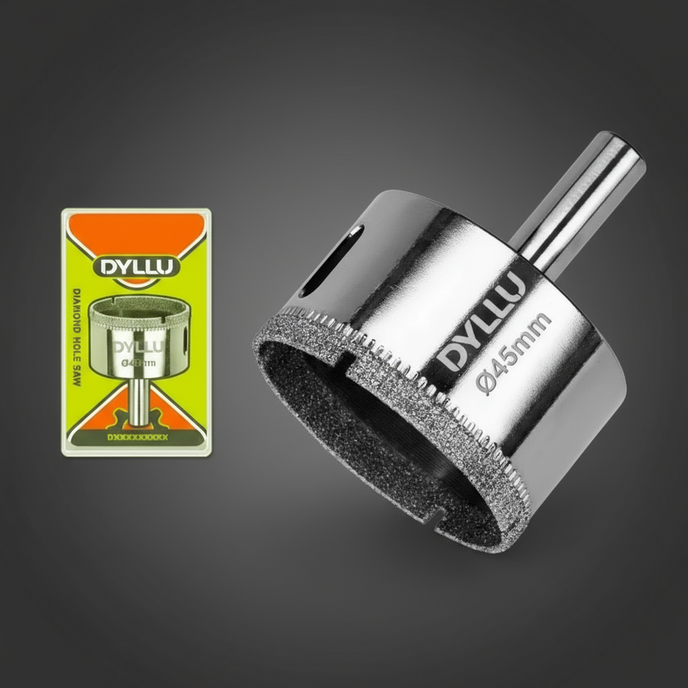 The Dyllu DTKJ7645 Diamond Hole Saw is built for clean and precise drilling through ceramic tiles, marble, granite, and other hard surfaces. Its 45 mm diameter and durable diamond-coated edge ensure efficient cutting when used with water for cooling.