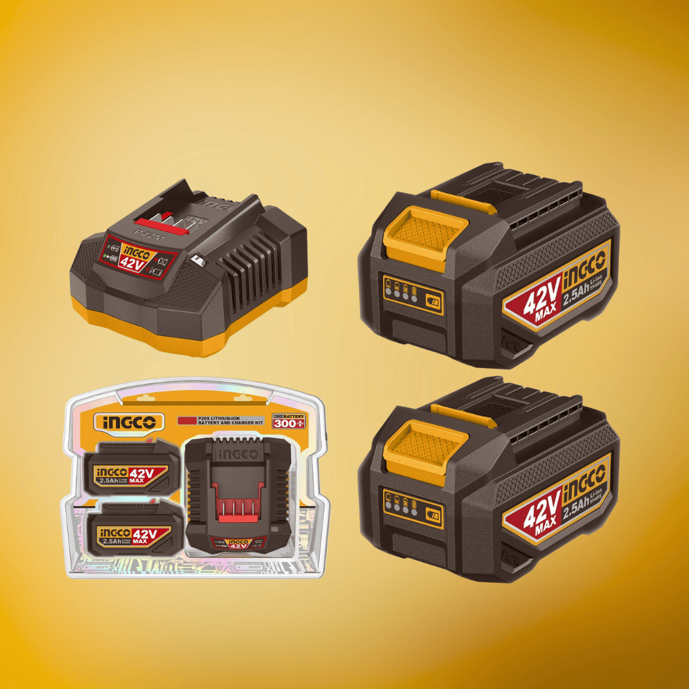 Power your Ingco 42V tool system with the FBCPM25221 Battery and Charger Kit. This comprehensive set includes two high-capacity 2.5Ah lithium-ion batteries and a fast 2A charger, ensuring you always have power ready for continuous work. Featuring LED power indicators and universal compatibility with all P42M series tools, this kit maximizes productivity for both professionals and DIY enthusiasts.
