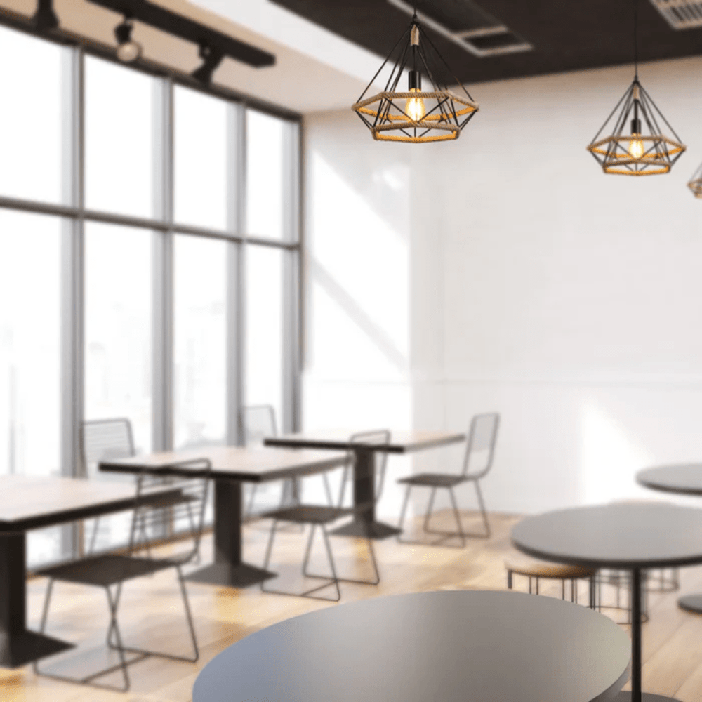 Add a rustic touch to your home or commercial space with the Manila Hemp Rope Diamond Pendant Light. This stylish fixture blends industrial design with a natural twist, featuring a black metal frame wrapped in manila hemp rope. The diamond shape adds a striking geometric flair, making it an eye-catching addition to living rooms, dining areas, cafes, or restaurants.