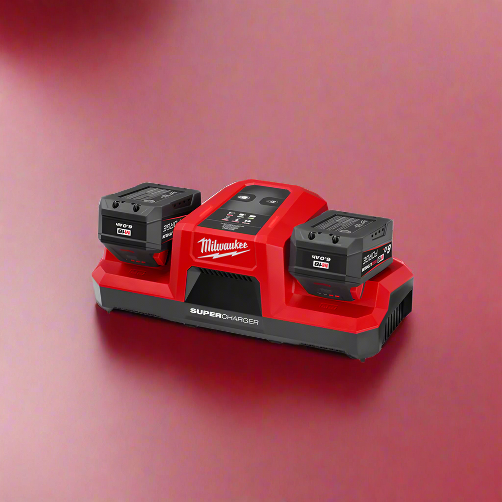 Charge two M18™ batteries simultaneously with the Milwaukee M18™ 18V Dual Bay Super Charger. It delivers rapid charging speeds, advanced heat management, and smart charge technology to keep your batteries ready for continuous use on demanding job sites.