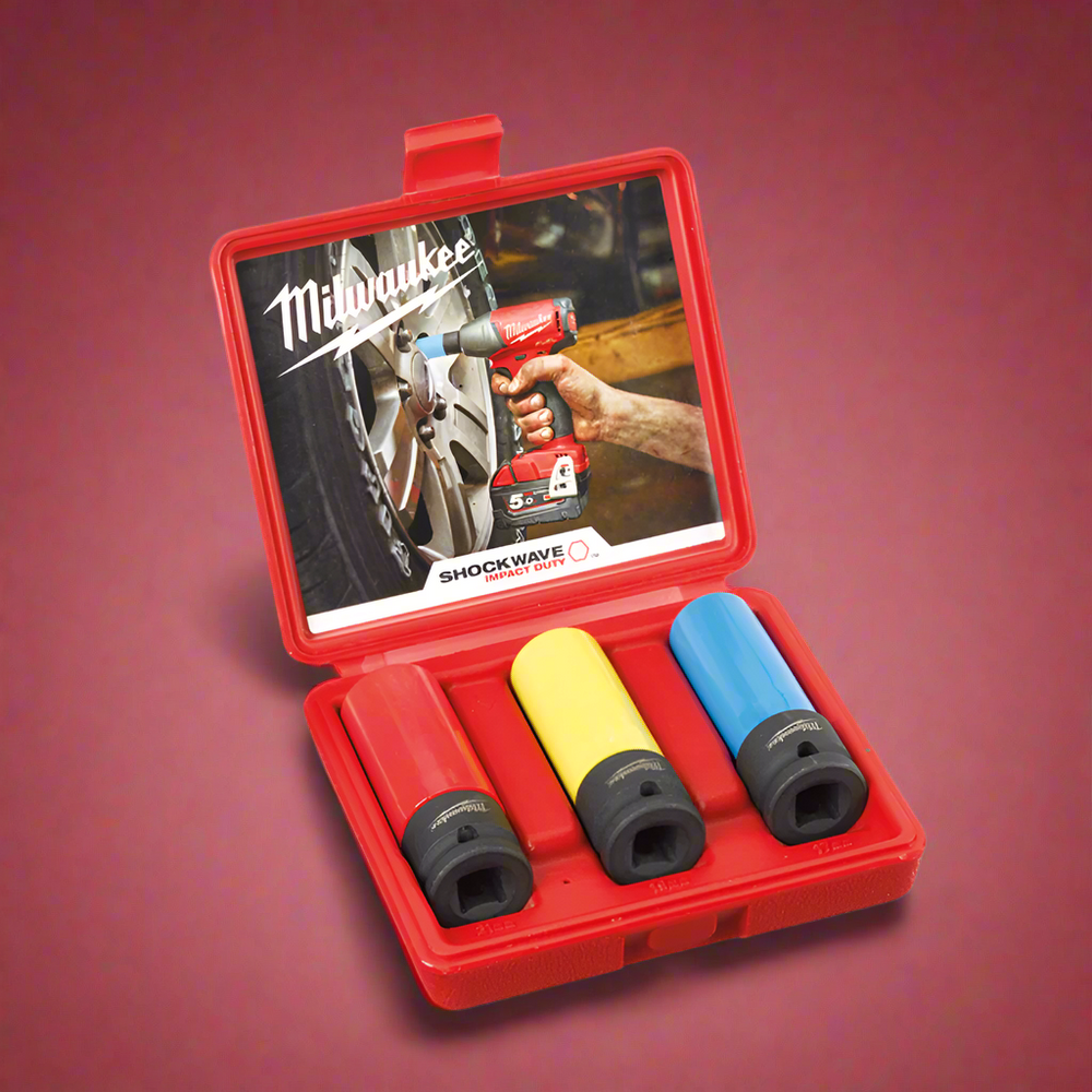 The Milwaukee SHOCKWAVE 3-Piece Automotive Impact Socket Set is engineered for strength, precision, and durability in demanding automotive applications. Constructed from premium impact-duty alloy steel, it delivers superior torque and long-lasting performance. The set includes 17mm, 19mm, and 21mm sockets with a ½” square drive—ideal for most wheel nut operations. Each socket features recessed corners to reduce stress, a plastic retainer for wheel nut protection, and color-coded sleeves with large size markings for quick identification and easy access.