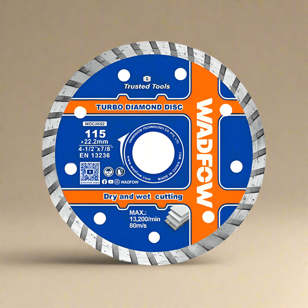 The Wadfow 115x22.2mm Turbo Diamond Cutting Disc – WDC3K02 delivers superior cutting performance for concrete, stone, tiles, and masonry. Engineered with a turbo segment and a 7.5mm wide blade, it ensures faster cuts and smoother finishes with reduced chipping—ideal for construction pros and DIY users alike.