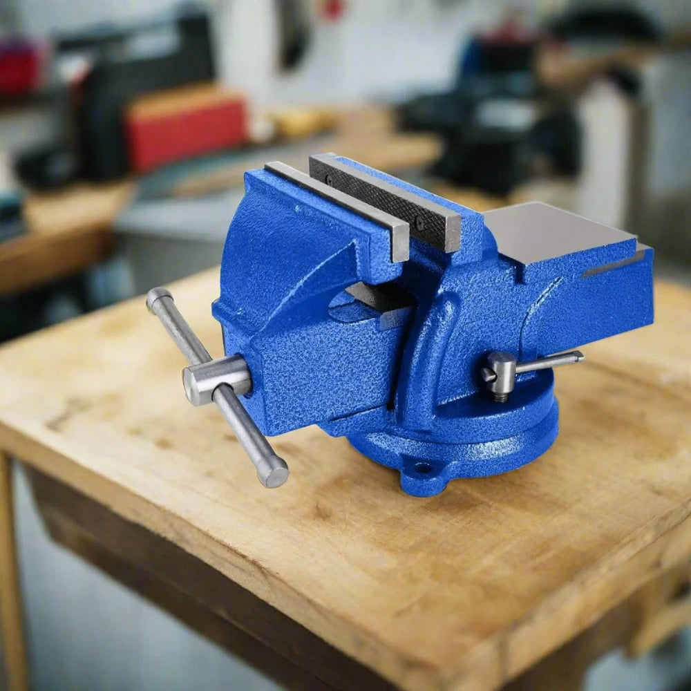 A sturdy 5″ bench vice made from cast iron with a 360° swivel base and built-in anvil—perfect for secure clamping during metalwork, woodworking, and general workshop tasks.